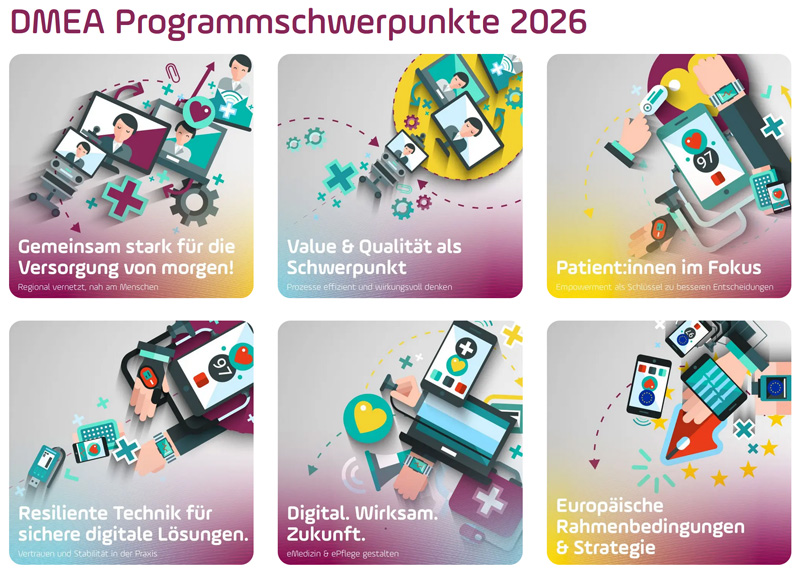 Was bewegt die Gesundheits-IT? Antworten auf diese Frage gibt die DMEA, eines der führenden Events Europas (Expo und Kongress) zum Thema Digital Health. Ziel ist, die Expert:innen der digitalen Gesundheitswirtschaft zusammenzubringen zum Informations- und Wissensaustausch, zur Präsentation von Produkt- und Projektneuigkeiten und zum Generieren neuer Geschäftskontakte.